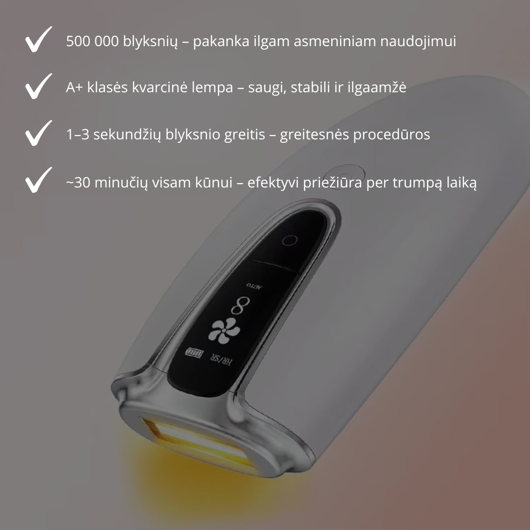 24 val., prieš procedūrą nuskuskite plaukelius. Kruopščiai nuvalykite odą, kad šviesos impulsas veiktų maksimaliai efektyviai.