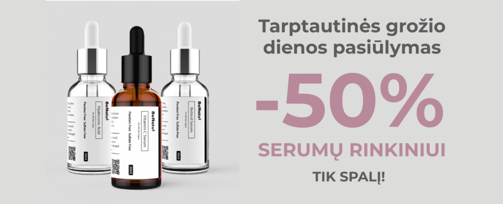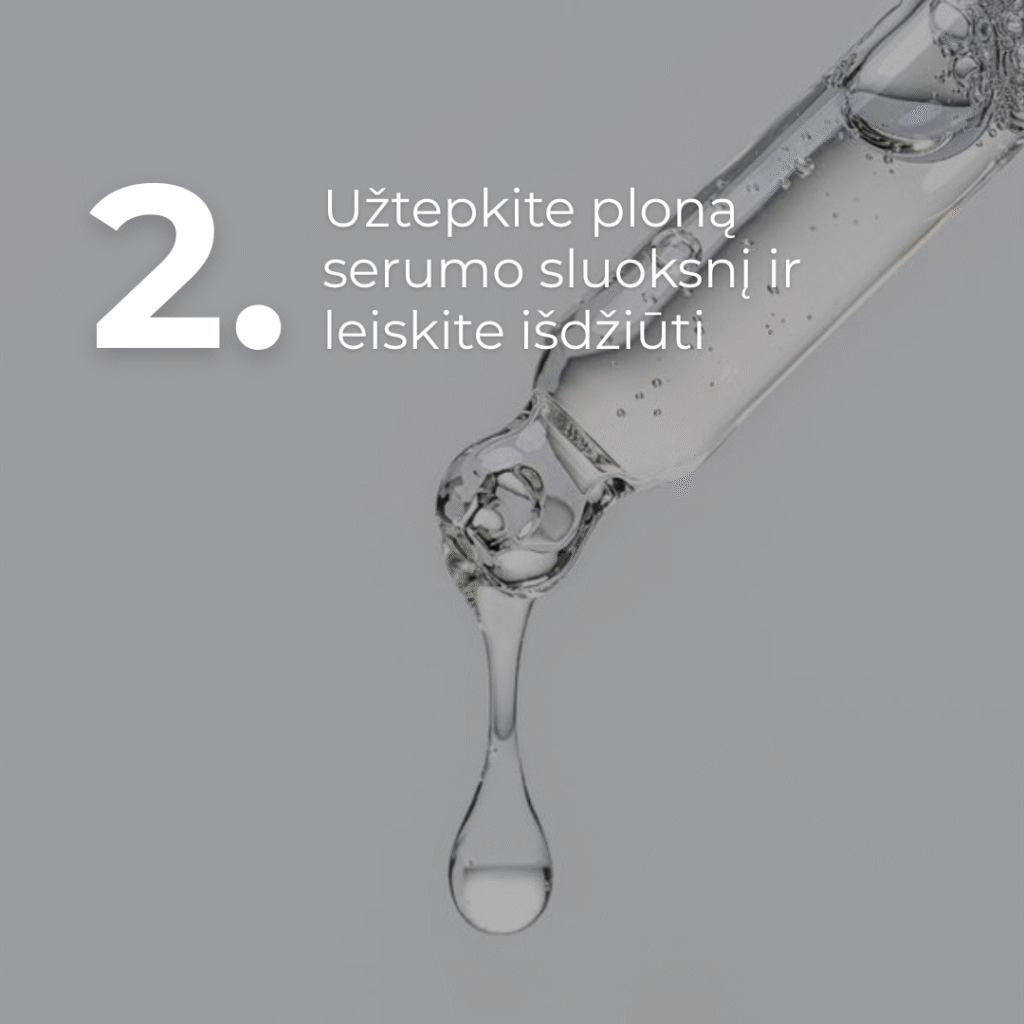 Geriausiam rezultatui pasiekti rytais tepkite hialurono serumą, o vakarais pakaitomis – retinolį arba Vitamino C serumą.
